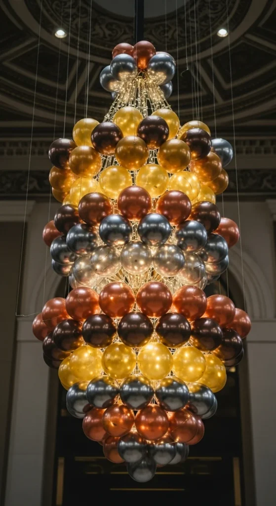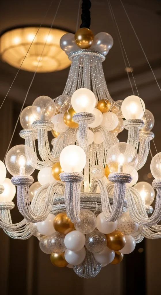 Balloon chandeliers work well for New Year styling because they draw eyes upward, add dimension to a room, and introduce festive sparkle without heavy décor. They can hang above dining tables, dance floors, entryways, dessert bars, stair landings, or living room seating zones. They pair nicely with satin ribbons, confetti-filled balloons, fairy lights, tassel fringe, disco accents, metallic streamers, acrylic signage, and mirror tiles. Below are ideas that fit apartments, rented halls, compact rooms, or open living spaces.