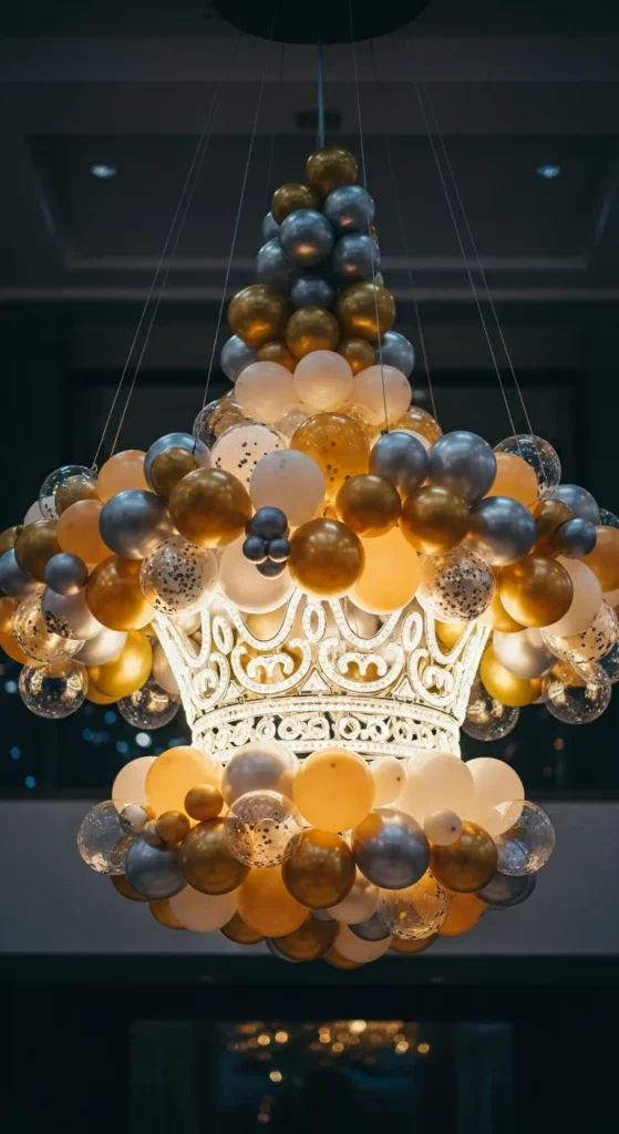 Place a small crown-style LED frame inside the balloon cluster for subtle shape recognition. Works best for themed gatherings. Keep lights soft and warm-toned for comfort.