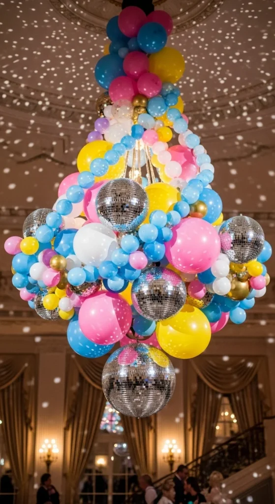 Place mini disco-balls between metallic balloons for reflective sparkle. Hang a slightly larger disco globe at the lowest point as a focal element. This creates a glamorous overhead effect. Place near dimmed spotlights or fairy lights to catch reflections. Works best for party rooms with music and photo zones. Keep disco items lightweight to avoid droop.