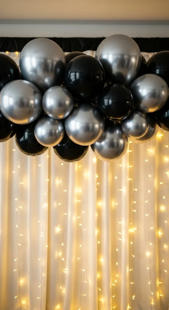 Arrange black and silver balloons in a dense cloud shape. Push smaller balloons into empty spaces to keep uniform. Add LED twinkle lights behind balloons using clear hooks. Install above a sitting lounge or corner sofa for relaxing visuals. Use matte black for contrast.