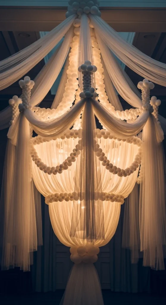 Hang sheer drapes below the chandelier so fabric catches light from balloons above. Use warm LEDs behind the drape for glow. Works above dining or display tables for dramatic style.