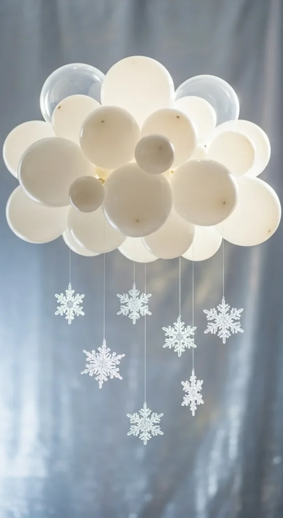 Combine white and clear balloons for a soft snow cloud look. Hang snowflake charms at varied lengths. Works well for colder climate themes. Position near neutral decor like grey linens and clear glassware.