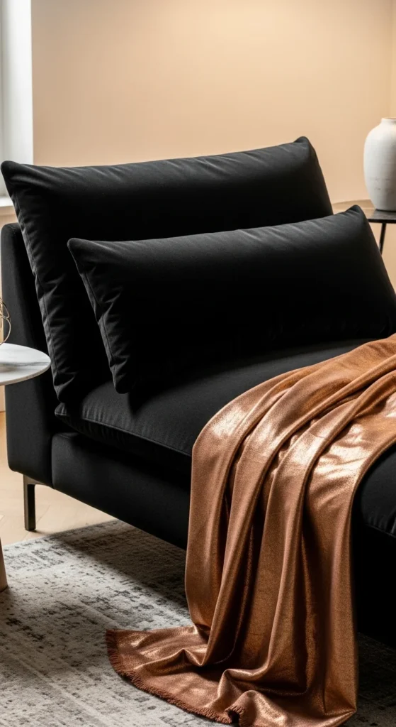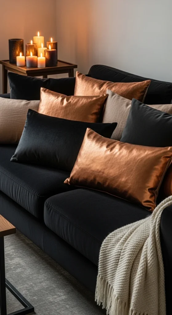 Start with the black sofa as your anchor and layer copper accents through cushions. Choose two or three textures: velvet, faux leather, and linen work well together. Let one or two cushions be a strong copper tone while the rest stay neutral—charcoal, cream, or soft taupe.
