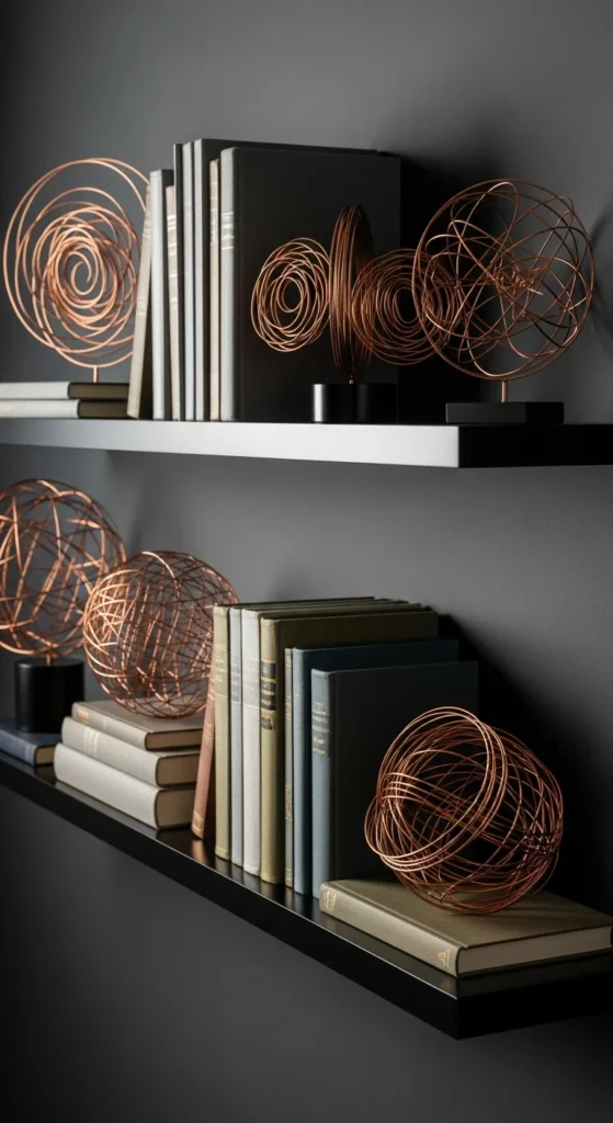 Buy crafting wire in a copper tone or repurpose old copper-colored hangers. Keep shelf backgrounds black or deep charcoal; black contact paper on the back panel works well in bookcases. Combine the wire pieces with a few dark-spined books and one or two glass items.