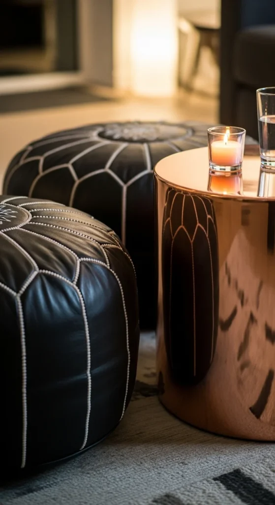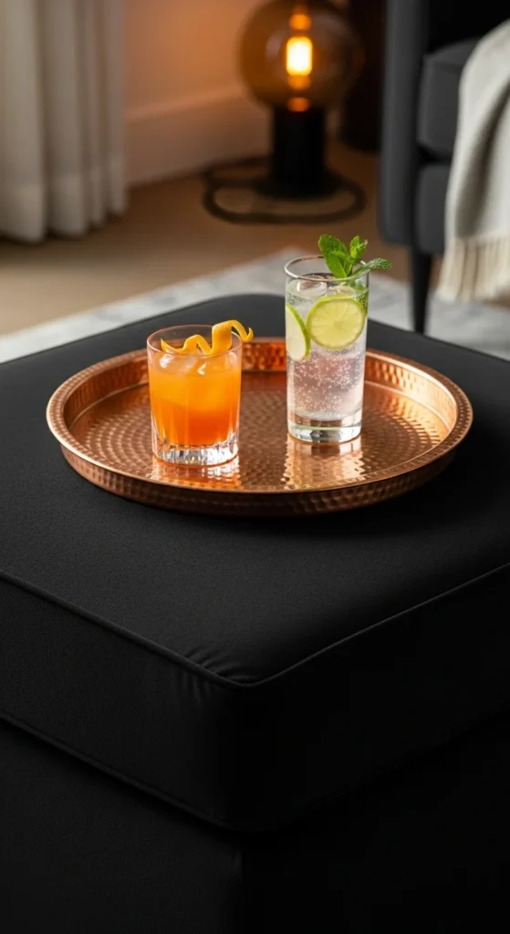 Use a black ottoman as both seating and table by placing a large copper tray on top. The tray stabilizes drinks and decor, while the soft surface keeps the space relaxed.