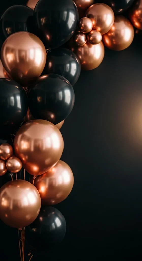 Use a balloon cluster to add drama without permanent décor. Choose matte black and metallic copper balloons, then cluster them in one lounge corner against a black or dark wall.