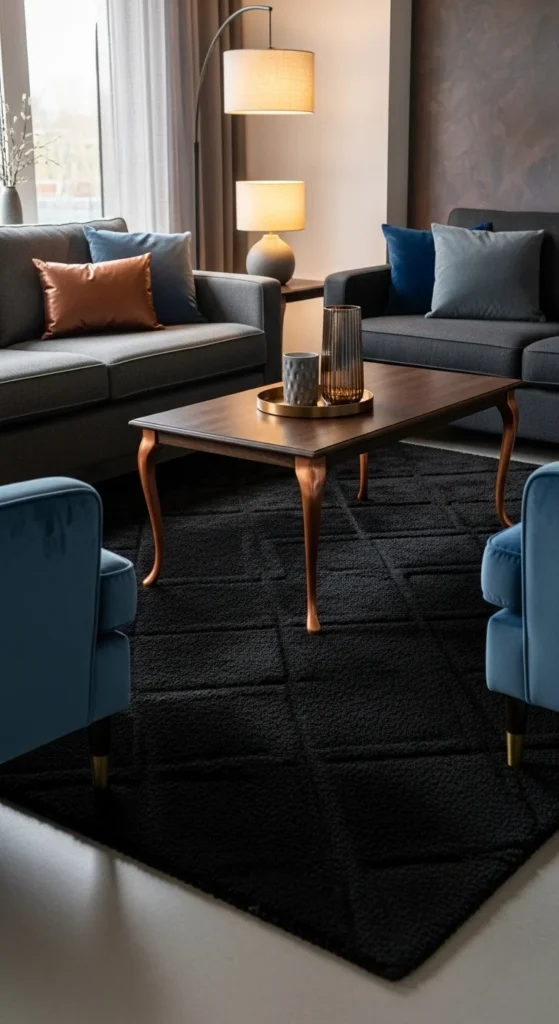This setup encourages relaxed conversation and adds visual fullness to your lounge without more furniture. Great for smaller rooms where chairs would crowd the space while still keeping the black and copper palette consistent.