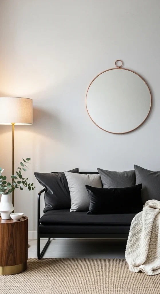 Hang a copper-framed mirror above your black sofa to bounce light around and lengthen the room visually. A round mirror softens sharp sofa lines, while the copper frame ties into the rest of your New Year metals.