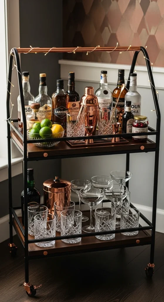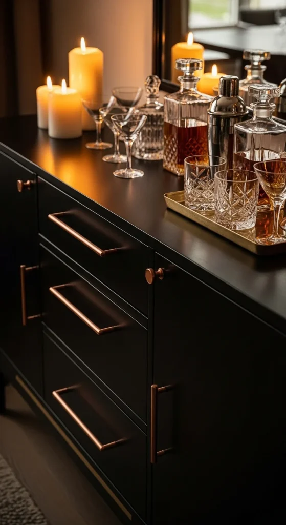 Place the tray on your coffee table or ottoman. Add one small dish of citrus slices or herbs for garnish. This tiny vignette functions as both service zone and décor. Guests see black and copper New Year style right where they pick up their drink.