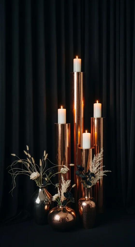 Mix matte black pieces with warm metal so nothing feels too shiny. Use greenery or dried branches to soften straight lines. On a budget, wrap existing candles with copper ribbon or thin foil near the base for a hint of color.