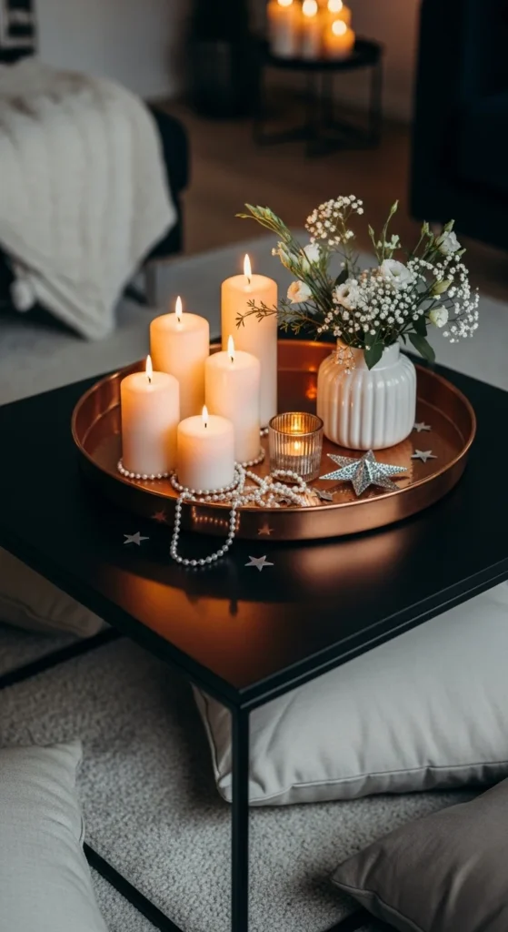 Arrange a cluster of candles, a small vase with simple greenery, and maybe a stack of coasters. Keep objects at different heights so the reflections feel layered. If you’re watching costs, thrift a metal tray and refresh it with copper spray paint. Even a baking sheet can work if you style it with care.