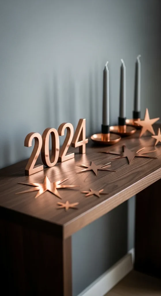 Use a black console table or TV unit as your main New Year styling surface. Keep it mostly functional but layer in small copper details: metal numbers for the year, tiny star cutouts, or one statement copper bowl.