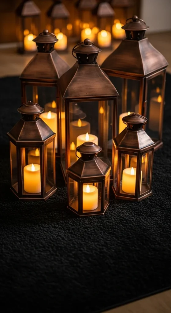 Create a floor-level lounge vignette using copper lanterns grouped on a black rug. Choose lanterns in a few heights so the arrangement feels layered. Place LED candles inside for safe, soft light.