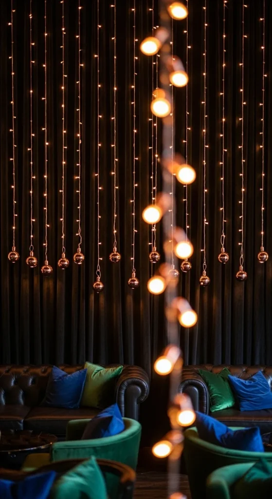 Use black curtains as a backdrop and layer copper-toned string lights over them. The dark fabric hides cords and makes every point of light stand out. Hang the lights loosely so they drape in vertical strands or gentle swag lines.