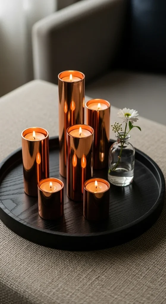 Use a black tray to group copper candle holders into a low, cozy centerpiece. Mix pillar holders, tealight cups, and one small bud vase. Keep heights varied but not too tall so conversation stays easy across the lounge.