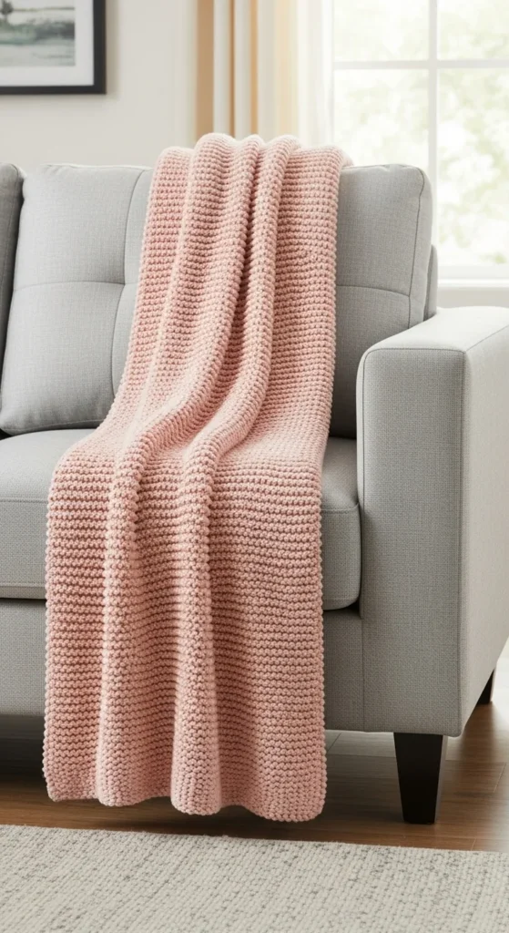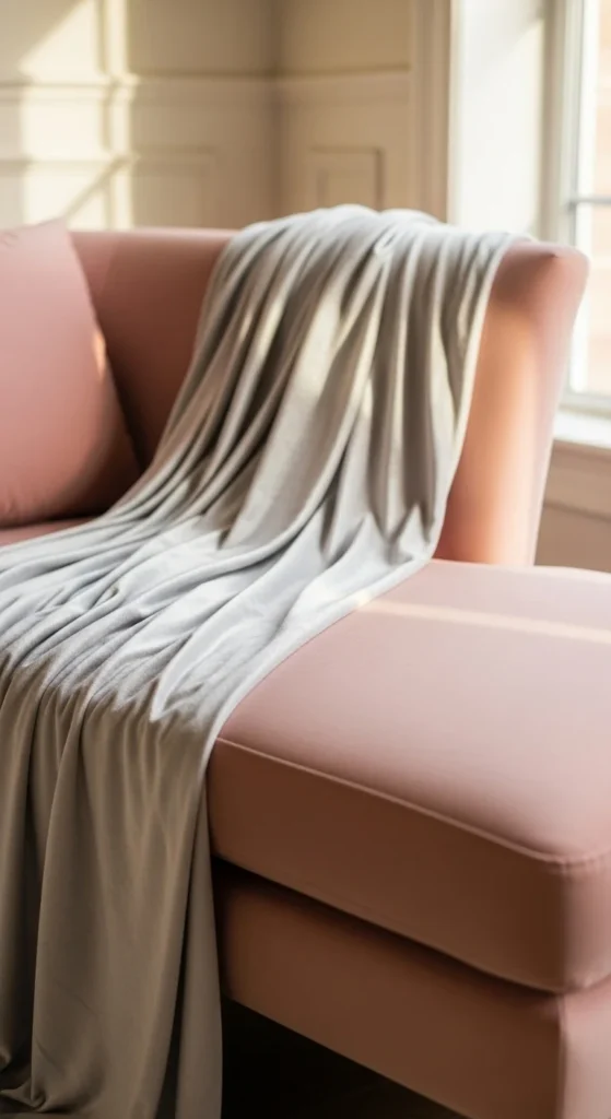 1. Blush Throw Draped Over a Silver-Toned Sofa