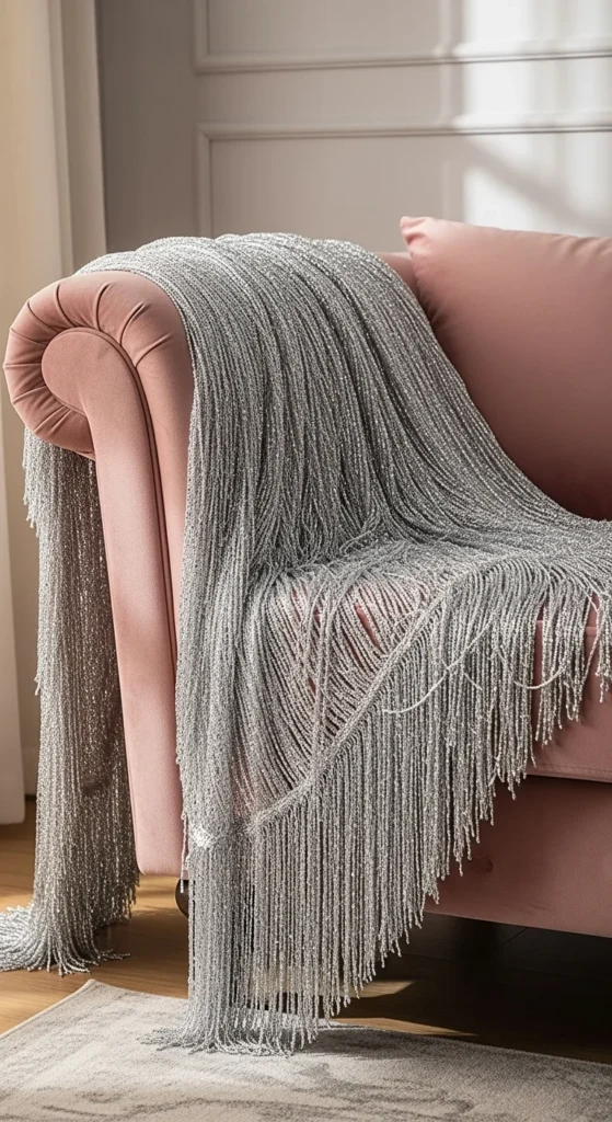 10. Silver Fringe Throw Over a Blush Sofa Corner