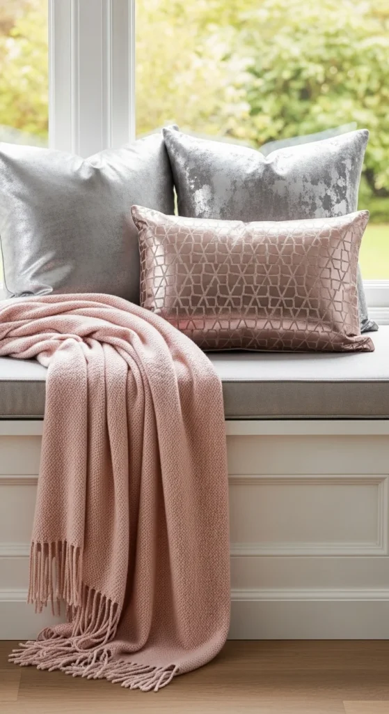 Lay a blush throw along a silver window seat to create a warm reading nook. Add soft metallic cushions for comfort. Keep the throw slightly wrinkled for a relaxed feel. Use a low-cost fleece throw if you’re working with a tighter budget. The natural light from the window helps both colors look soft and calming. This setup is perfect for smaller homes where you want a quiet corner for reflection.