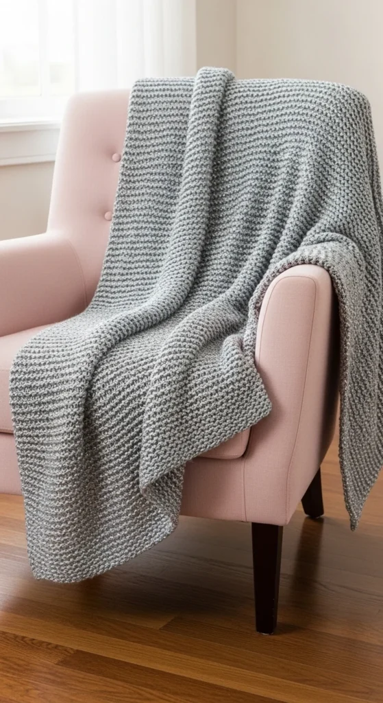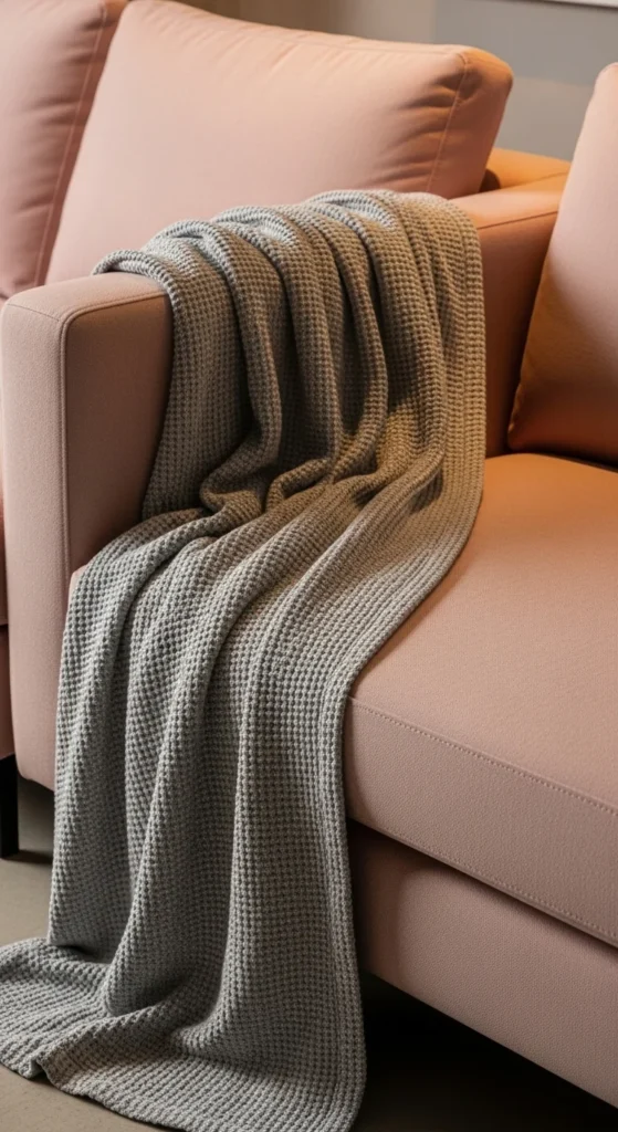 Use a waffle-textured silver throw on a blush sectional to add a bit of structure. The raised pattern reflects light subtly. Keep the throw spread wide to break up large seating. Add a few small blush cushions to tie everything together. Choose a budget-friendly waffle blanket for similar texture without high prices. This look works well for family rooms where comfort and simplicity matter most.