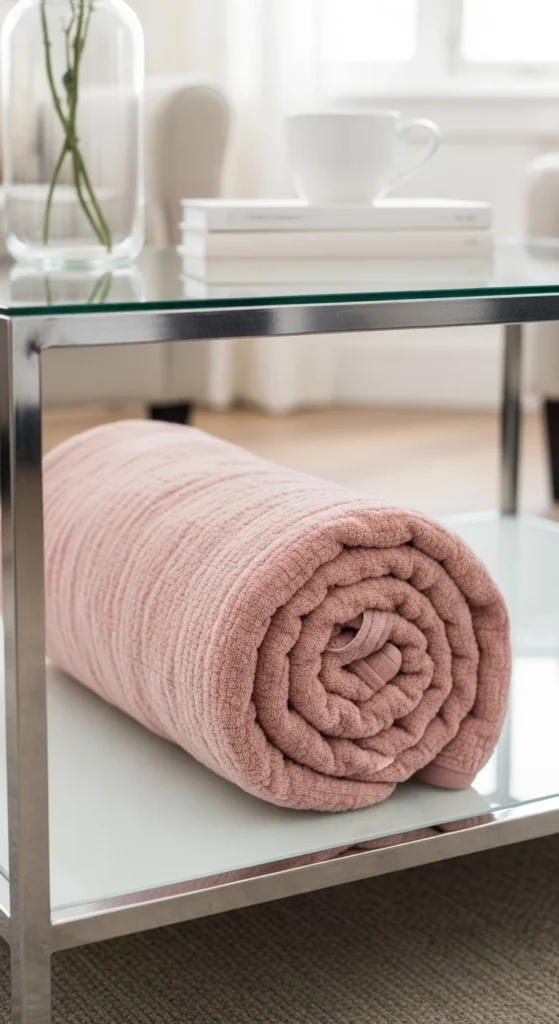 Roll a blush throw and place it on the lower shelf of a silver coffee table. This adds warmth without crowding the tabletop. Keep the roll loose so the texture remains visible. Add a small basket or a few books beside it. For a cost-friendly version, use a lightweight blush blanket. This setup is great for minimalist spaces where you want small touches of softness.