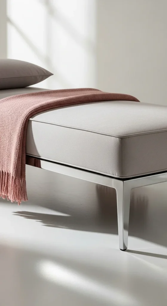 Tuck a blush throw into the corner of a silver daybed to soften the space. Pull part of the throw upward to create gentle folds. Add two cushions—one blush, one metallic—for consistency. If you’re saving money, use a simple brushed throw. This setup works well in guest rooms that double as lounge spaces.