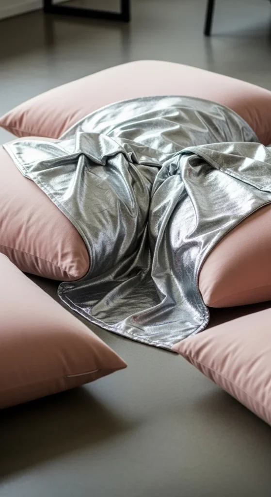 Spread a silver throw over blush floor pillows to create a relaxed lounge zone. Keep the throw loose for a casual feel. Add a tray with snacks or warm drinks for extra comfort. For an affordable version, choose a basic silver fleece throw. This idea works well for movie nights or low-seating living rooms.