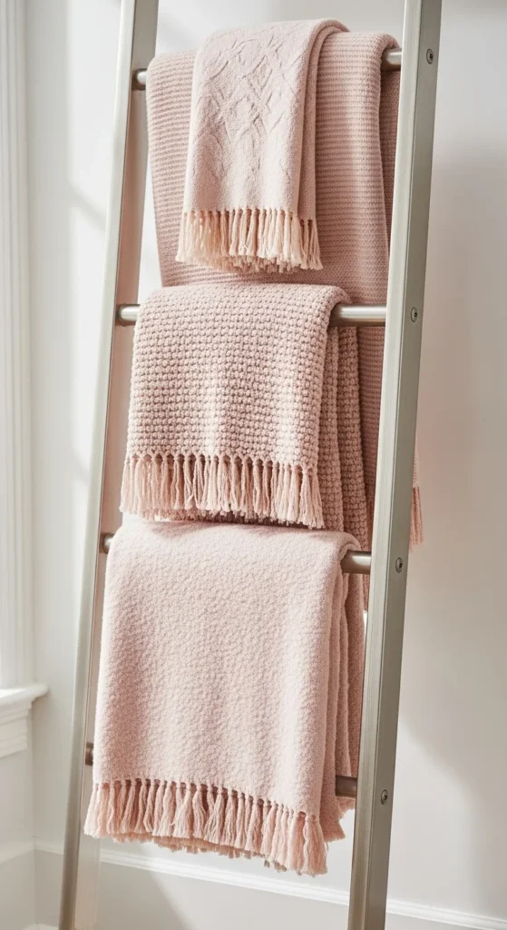 Hang a blush throw over a silver blanket ladder for a simple decorative touch. Fold the throw neatly to keep the ladder visible. Add a second silver throw underneath for layering. Use a basic metal ladder for a low-cost option. This setup works well behind sofas or near hallways.