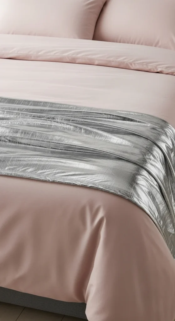 Spread a silver metallic throw across a blush bedspread to add subtle shine. Keep the throw centered for a balanced look. Add two small blush cushions to anchor the palette. For a low-cost approach, choose a simple metallic-finish fabric. This bedroom design feels winter-friendly and calming.