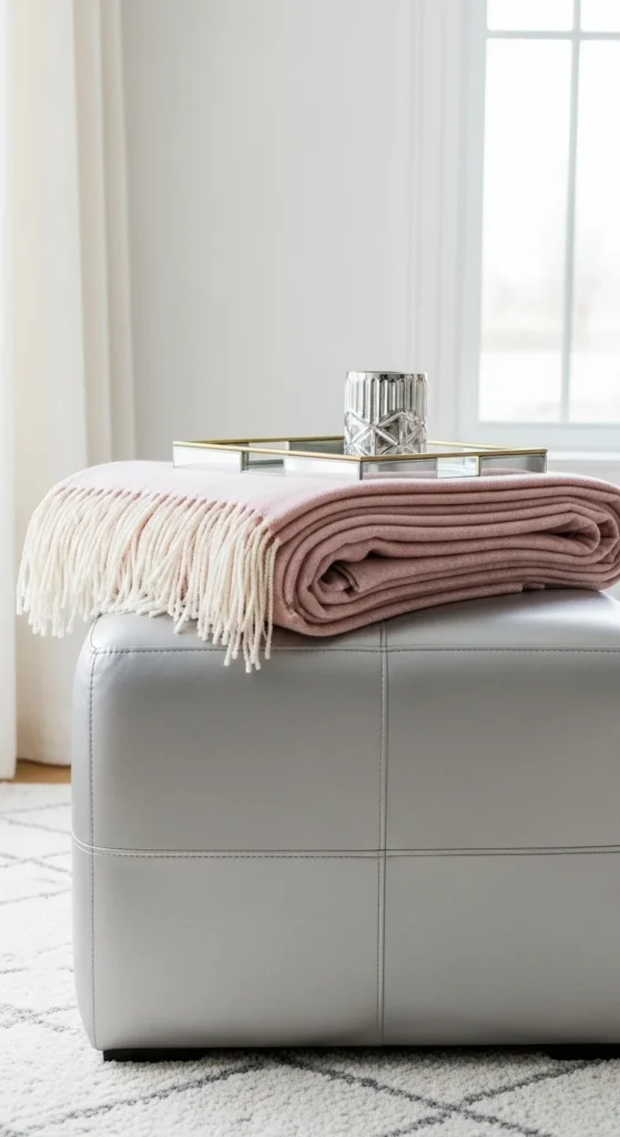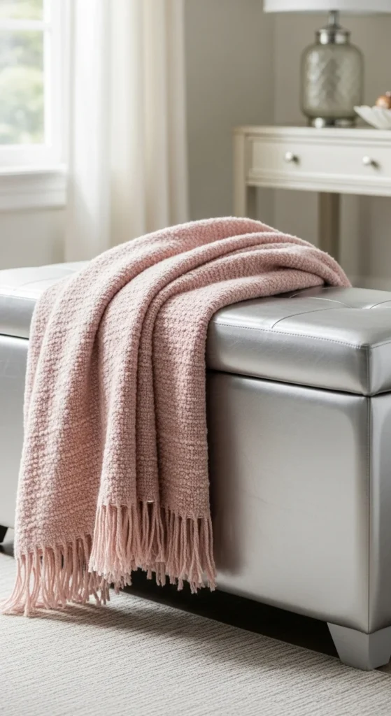 Add a folded blush throw to a silver ottoman for a simple and tidy accent. Keep the fold long and clean so the ottoman shape stays visible. Place a tray on top with small items like books or a candle. This creates a grounded look that complements living room seating. For a budget option, use a lightweight blush fleece blanket—it folds easily and stays in place. This setup is easy to adjust whenever you rearrange the room. The blush-and-silver combination adds warmth without overwhelming the space.