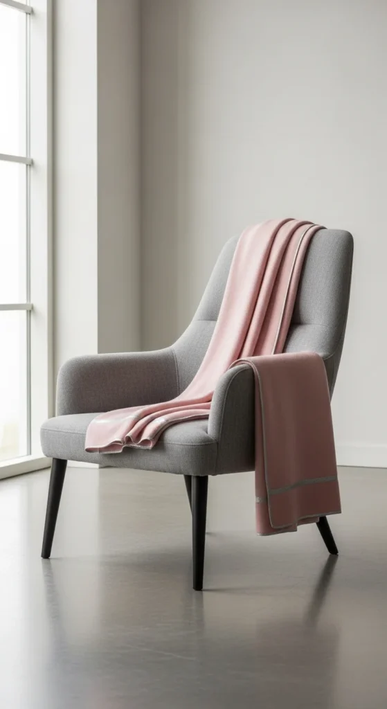 Use a blush throw with subtle silver trim to tie both colors into one piece. Drape the throw across the back of the lounge chair for a soft look. Add a small metallic cushion to complete the palette. If you’re saving money, add a simple silver ribbon trim to an existing blush blanket. This setup works well in living rooms or bedrooms where you want a simple accent.