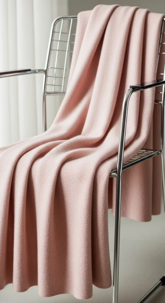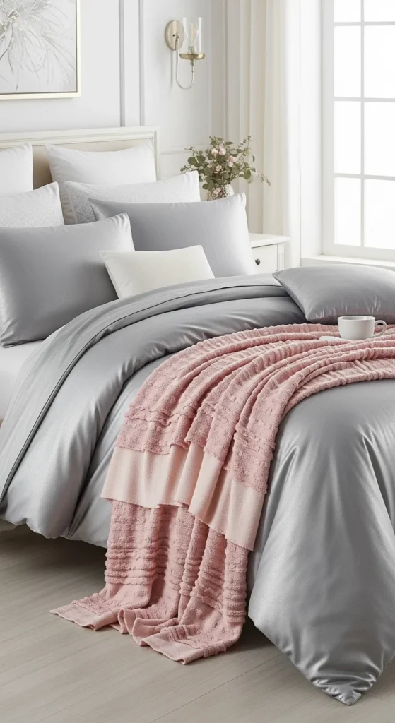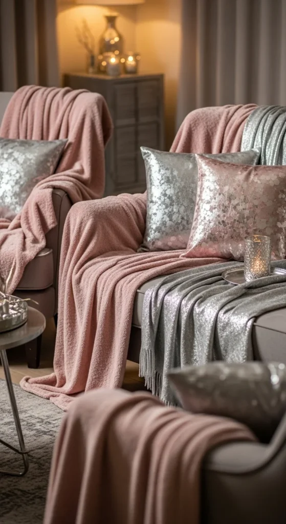 Spread a blush throw across a silver accent chair for an inviting look. Keep the throw loose so the chair’s structure remains visible. Add one small metallic cushion for balance. This style works well in corners, near entryways, or beside windows. For a more affordable option, use a brushed microfiber throw. The blush-and-silver color pairing helps brighten the area without adding clutter.