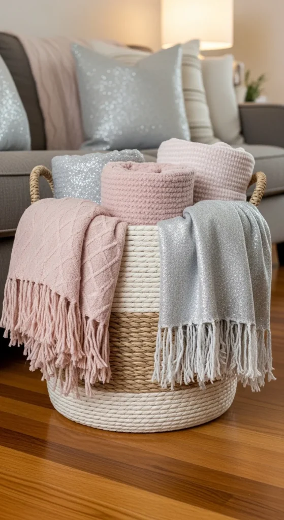 Place blush and silver throws neatly in a woven basket beside your sofa to create a functional and decorative corner. Roll the throws instead of folding them—it keeps the basket tidy. Choose a natural-toned basket so the blush color stands out. For a lower-cost method, reuse any spare storage basket you already have. Add one small cushion at the back of the basket to elevate the throws visually. This idea is practical for family rooms where you want warmth within reach. A floor lamp nearby helps the metallic tones shine softly at night. This setup also works well for guests who may want extra comfort during gatherings.