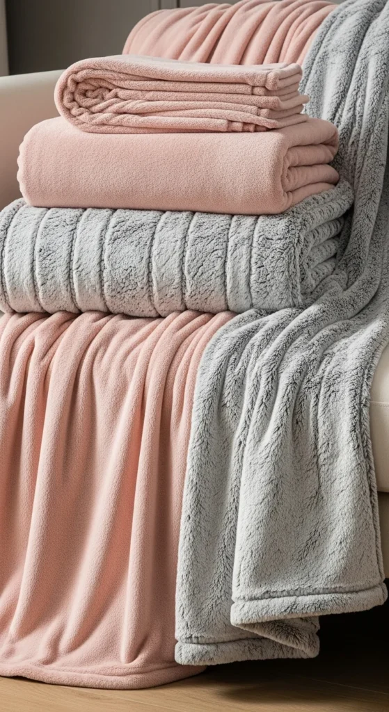 Layer a blush throw beneath a soft silver faux-fur blanket for a cozy two-texture moment. Keep the blush layer visible at the edges for color contrast. Faux-fur adds warmth while blush keeps the palette soft. For an affordable approach, choose a faux-fur blanket with a shorter pile—it still feels plush. Let the fur layer drape loosely so the blush fabric peeks through naturally. This setup works beautifully in living rooms with neutral tones.
