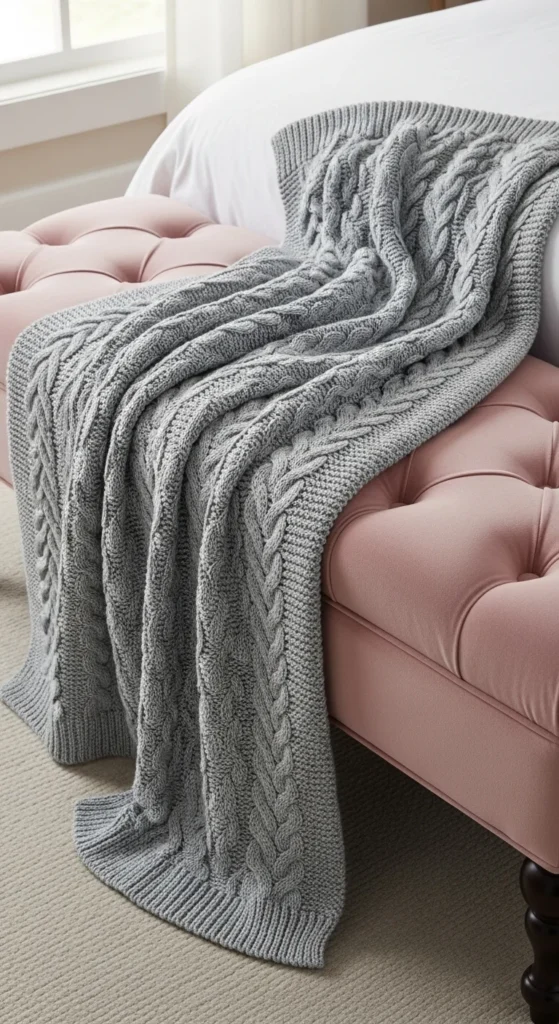 8. Silver Cable-Knit Throw Across a Blush Bed Bench