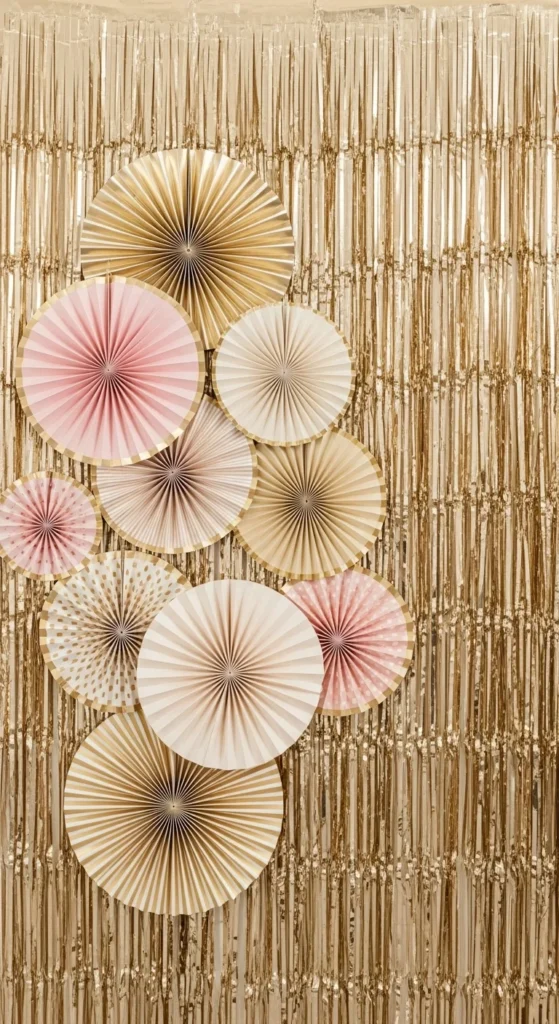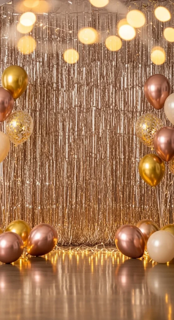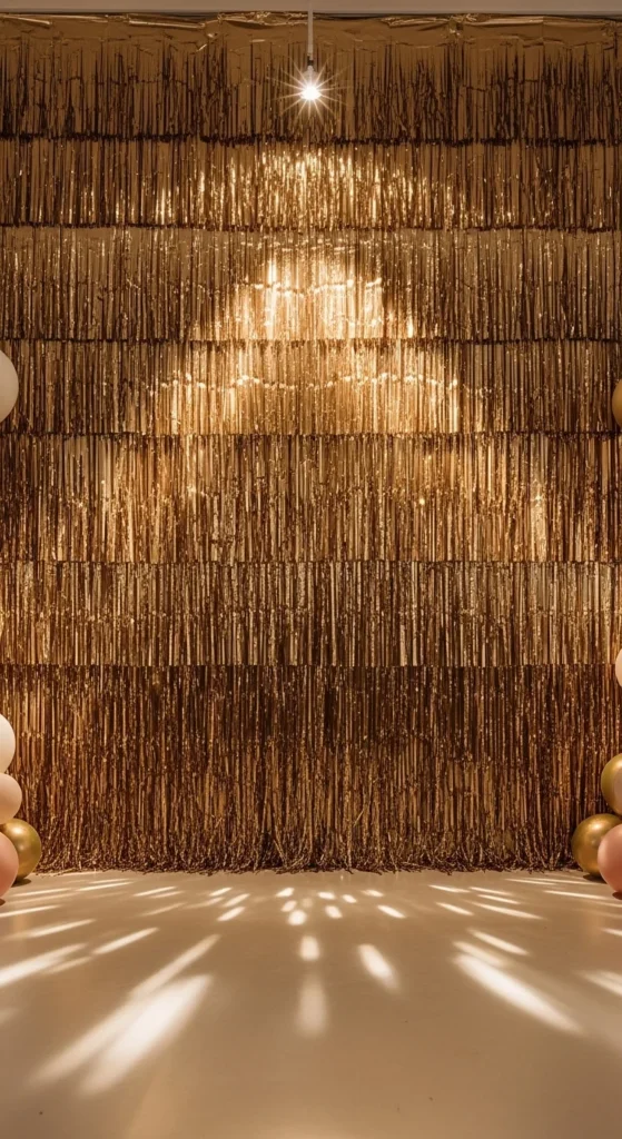 Champagne-gold fringe backdrops suit New Year styling because they reflect light, look festive without heavy props, and work for both home settings and event spaces. They pair with balloons, mirrors, candles, chrome accents, satin fabrics, disco-ball details, and velvet seating. You can build them from foil curtains, fringe sheets, tassel strings, metallic ribbons, or layered tinsel panels. Whether you’re styling a photo-corner, dining zone, dessert table, or balloon arch base, these ideas help you set a polished look without large furniture or expensive installations.