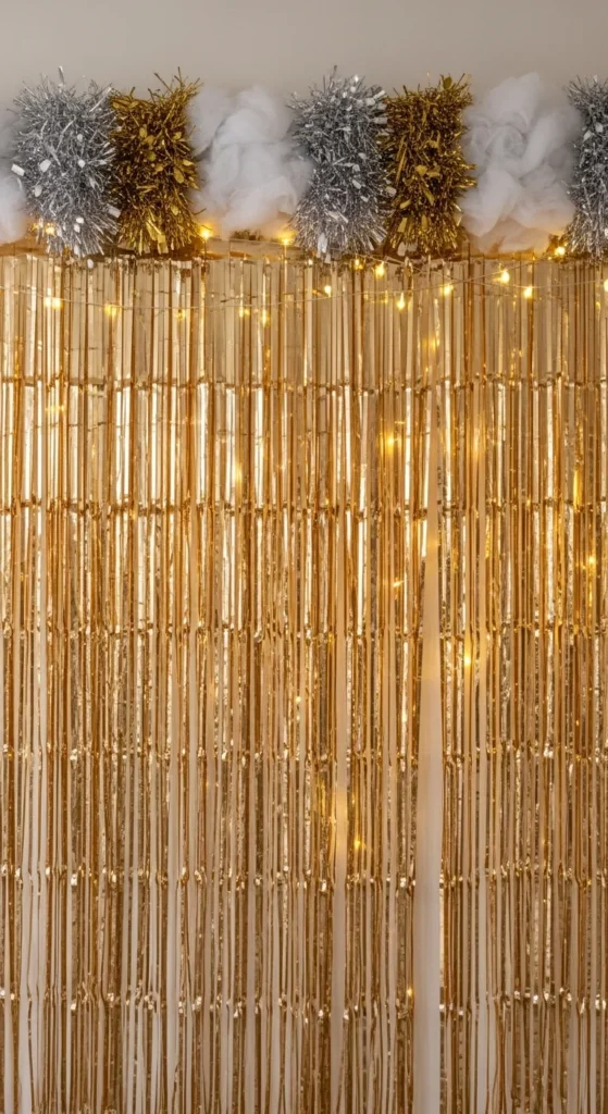 Create a fluffy “cloud” border using tinsel garland across the top of the fringe. This softens the top line where panels meet the rod. Add fairy-lights behind fringe so strands catch sparkle. Keep tinsel fluffy instead of tight. This backdrop suits both floor-level and table-behind setups. Match tinsel with a small garland on a nearby console table.