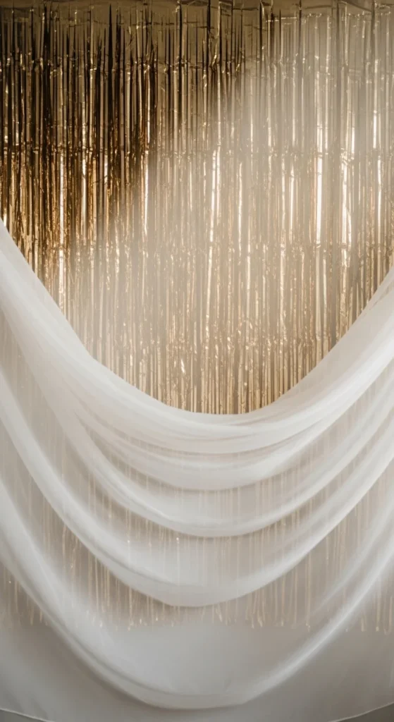 Hang sheer curtains loosely over the fringe panels so gold shines behind. Tie curtains slightly to one side using satin ribbon for an open look. Add fairy-lights behind fringe for soft haze. This effect works well for group photos because the sheer layer hides any uneven spacing.