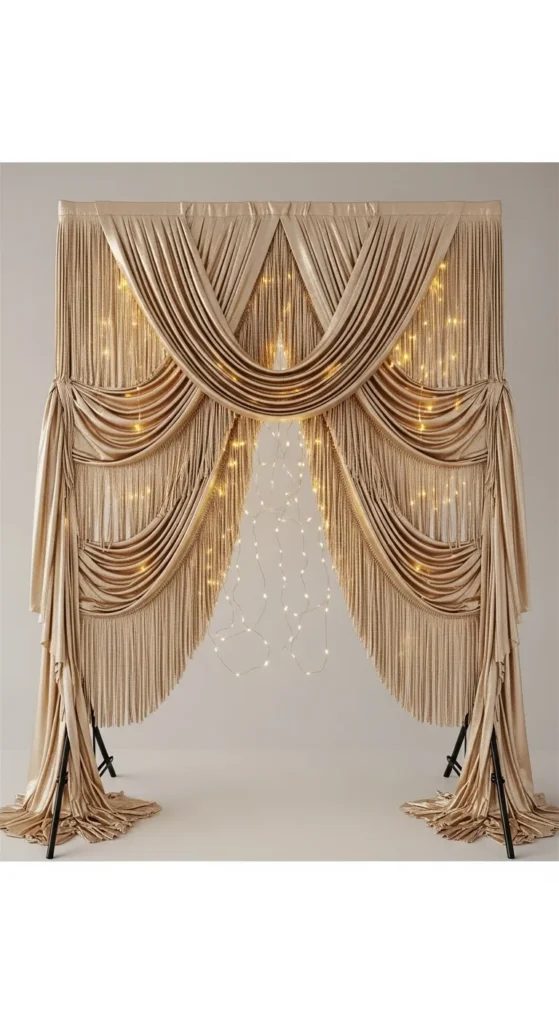 Set champagne-gold fringe at the center and frame both sides with velvet fabric panels. Use a tension rod or curtain pole. This balances shine with soft texture. Choose velvet in black, emerald, burgundy, or navy. You can use inexpensive curtain panels or two long throws clipped with curtain rings. Add a small rug or velvet ottoman in front for seated photos. Keep accessories minimal since both fabrics carry strong visual interest.