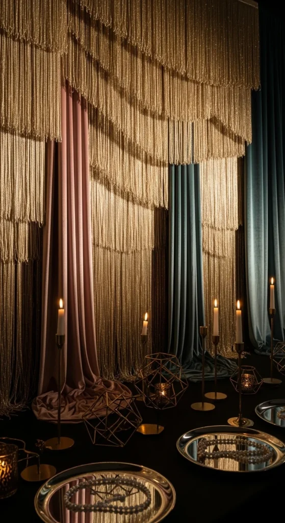 Attach fringe to a folding room divider using clips or tape. This gives a movable backdrop option. Fold slightly to form a V-shape for stability. Place LED candles or chrome decor pieces at the base. Store the panel folded with fringe rolled upward to prevent creases.
