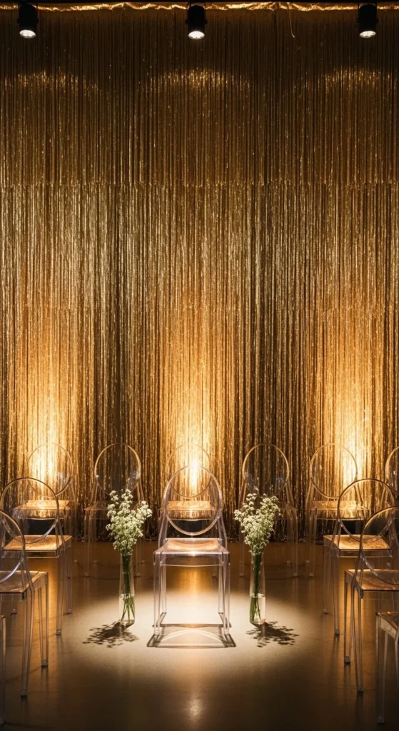 Place acrylic ghost-chairs in front of the champagne-gold fringe for an airy photo zone. The clear seating allows full reflection of backdrop strands. Add LED candles near the floor for a warm glow. Place one or two metallic cushions on the chairs for comfort. Use a short, narrow table to hold hats, masks, or disco props. Sweep the floor so the strands lay neatly in photos. Take photos from slightly lower angles to reflect lights.