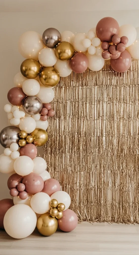 Create a half-arch using matte and chrome balloons, placing fringe at the center. Balance the arch from one side only to keep view open. Use two gold tones plus cream or blush to keep colors aligned. Add fairy-lights inside the balloon arch for glow. If balloons touch fringe, avoid hot lights. This setup suits doorways or one corner of a lounge room. Use removable hooks so walls stay clear.