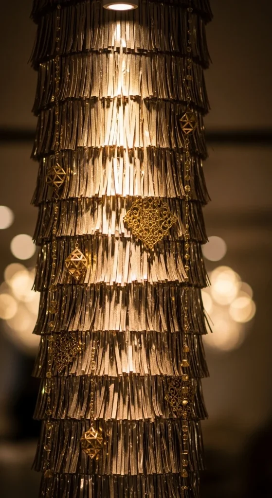 Create a faux pillar using a cardboard tube or rolled carpet core. Wrap fringe sheets around the vertical piece and stand it beside the backdrop. This adds a stage-like effect. Add LED spot lighting from the floor to highlight the column. You can create two columns if space permits. Decorate the top segment with a small bow tie or tassel cluster for detail. Make sure the base stands firm using weights or double-sided pads.
