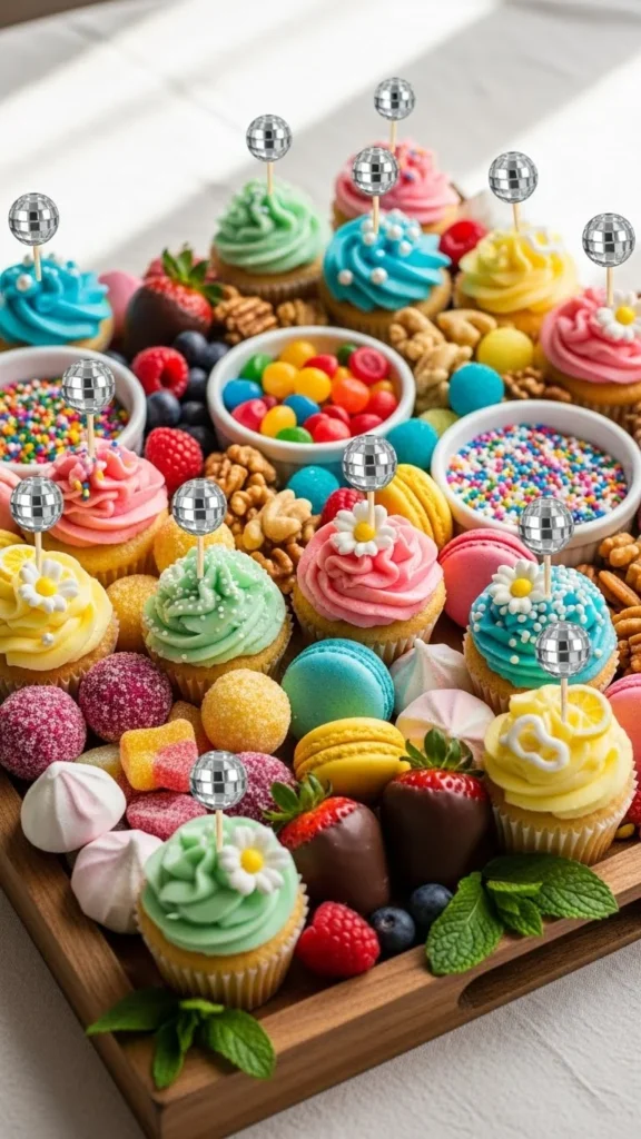 Arrange cupcakes, mini donuts, chocolate truffles, and macarons on a charcuterie board. Add disco picks to random treats so sparkles spread across the board. Scatter edible stars lightly for a holiday vibe. Add two small tea lights near edges for glow.