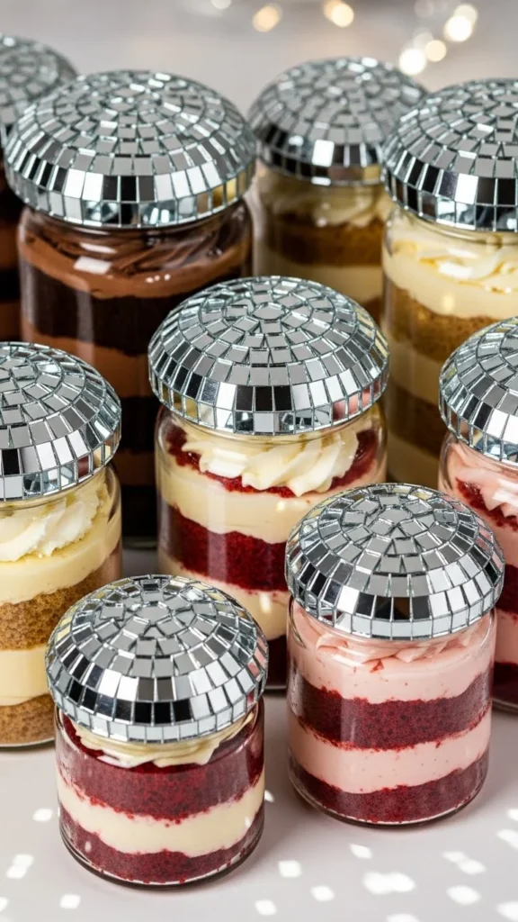 Disco-ball dessert toppers bring sparkle to New Year parties, especially when paired with metallic sprinkles, mirror tiles, confetti flakes, and glossy frosting surfaces. These toppers work with cupcakes, donuts, macarons, mousse cups, cheesecake jars, tiramisu tubs, and layered dessert bites. They can be DIY using mini plastic balls, mirror mosaic sheets, or faux disco craft supplies. Below, you’ll find creative ideas that mix sparkle, texture, and height without heavy spending or pastry skills.