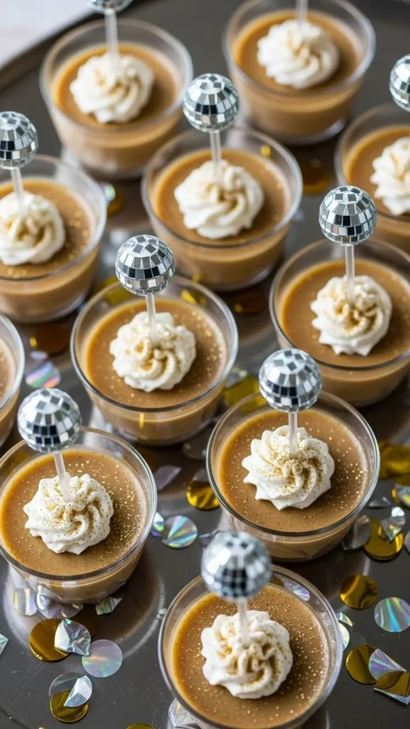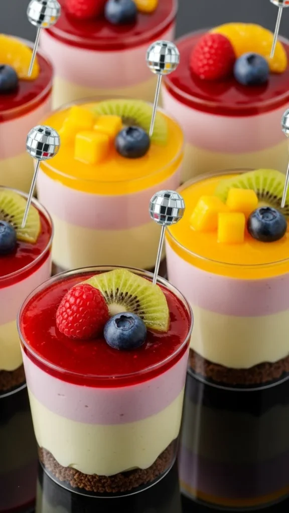 Fill plastic pudding cups with vanilla pudding and sprinkle edible glitter. Insert disco swizzle sticks for decoration. Avoid alcohol if serving kids. Add small fruit cubes on top for taste contrast.