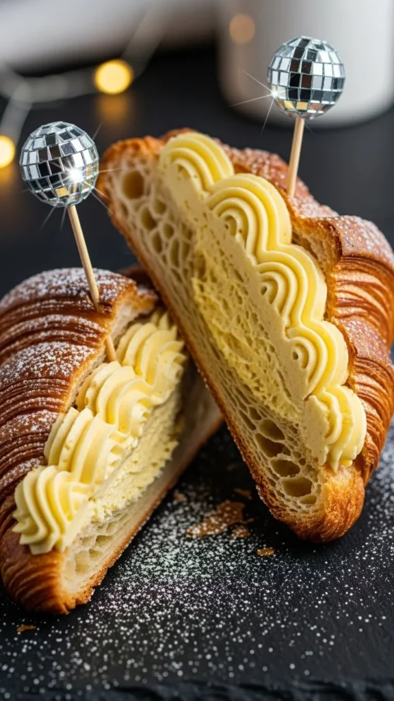 Slice croissants and fill with whipped cream or custard. Add small disco picks at the top. Dust lightly with icing sugar. Add sliced strawberries for contrast. Works for morning-after brunch tables too.