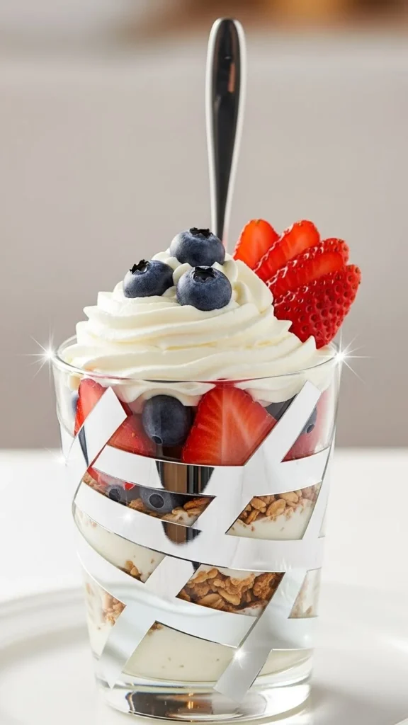 Fill parfait cups in white-and-gold layers. Decorate spoons using mirror tape for sparkle. Insert spoon diagonally so it photographs well. Avoid heavy toppings that sink.