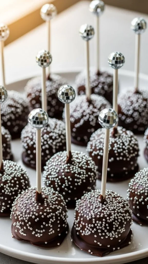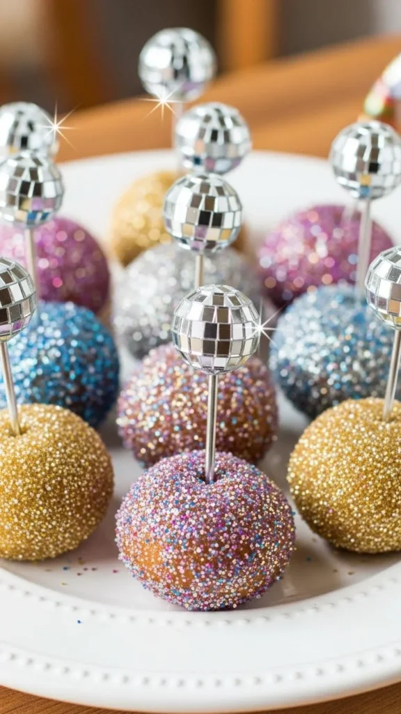Glue mini disco-balls to the ends of cake pop sticks, then dip cake pops in white chocolate or gold chocolate drizzle. Dry pops standing upright for a clean finish. Sprinkle edible glitter while coating is slightly wet. Use a foam block to display pops without crowding. Keep sticks at equal heights for neat photos.