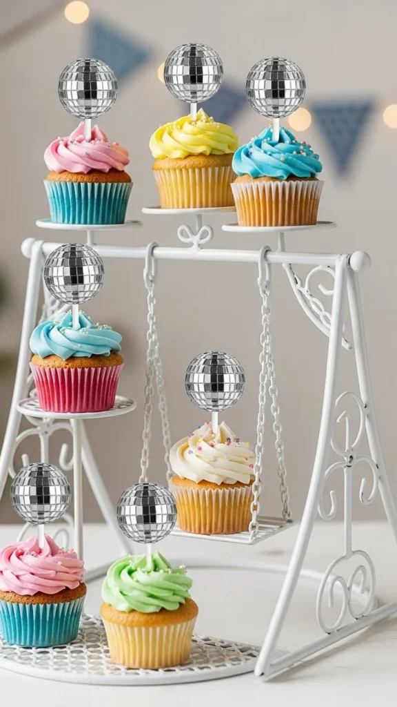 Use a swing cake stand and arrange cupcakes with disco toppers. Add fairy lights wrapped around swing posts. Space cupcakes evenly so none lean. Photograph from a low angle for reflective shots.