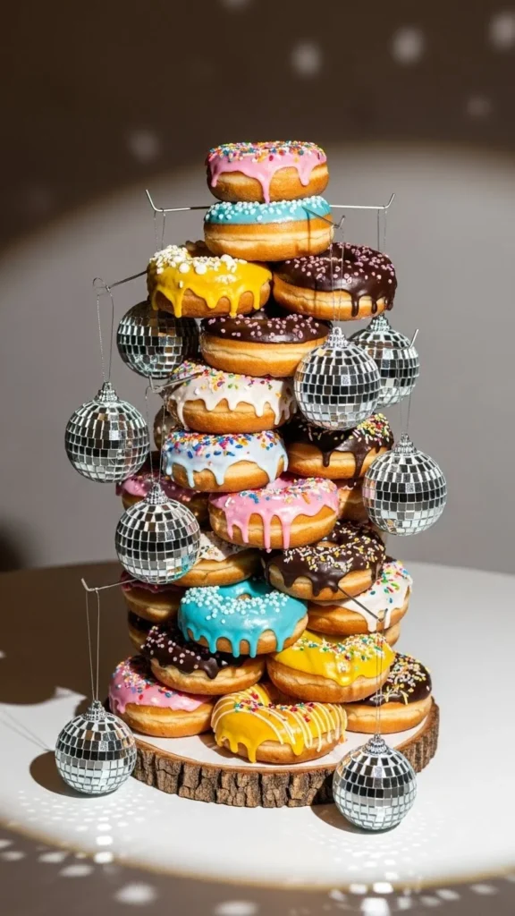 Stack donuts on a tall rod or cake stand. Hang tiny disco ornaments from a short bar above so they dangle near the donuts without touching icing. This creates a floating sparkle effect. Dust donuts lightly with powdered sugar so reflections stand out. Use matte glazes to balance shine.